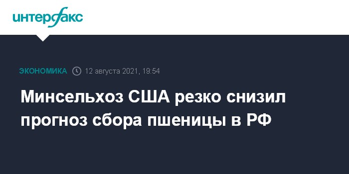 Москва. 12 августа. INTERFAX.RU - Минсельхоз США резко, с 85 млн до 72,5 млн тонн, снизил прогноз сбора пшеницы в РФ в этом году, следует из августовского обзора ведомства.