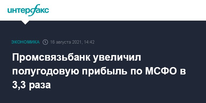 Москва. 16 августа. INTERFAX.RU - В первом полугодии 2021 года Промсвязьбанк увеличил чистую прибыль по МСФО в 3,3 раза - до 24,3 млрд рублей, следует из отчета кредитной организации.