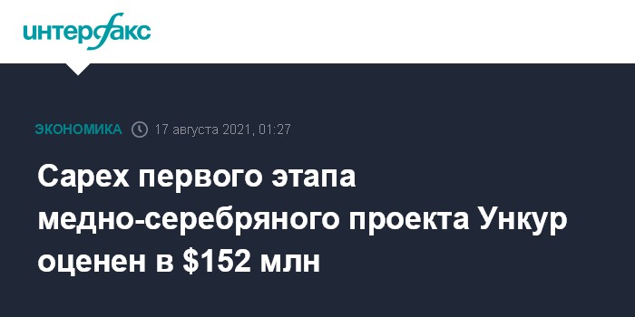 Capex первого этапа медно-серебряного проекта Ункур оценен в $152 млн