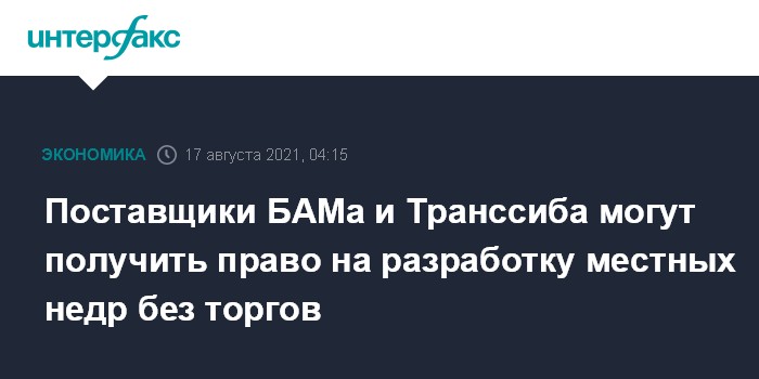 Москва. 17 августа. INTERFAX.RU - Российские регионы, по территориям которых пролегают Байкало-Амурская и Транссибирская магистрали, могут получить право предоставлять без торгов лицензии на пользование месторождениями полезных ископаемых, направляемых для модернизации этих железнодорожных линий.