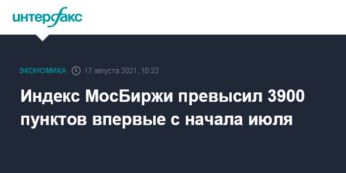 Москва. 17 августа. INTERFAX.RU - Индекс МосБиржи, один из основных российских фондовых индикаторов, утром во вторник впервые с начала июля превысил рубеж 3900 пунктов на фоне ослабления рубля и роста ряда бумаг-"тяжеловесов".