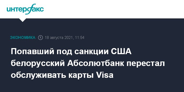 Москва. 18 августа. INTERFAX.RU - Белорусский Абсолютбанк, который попал под санкции США, сообщил клиентам-физлицам, что прекращает определенные операции, в том числе выдачу и обслуживание платежных карт Visa.