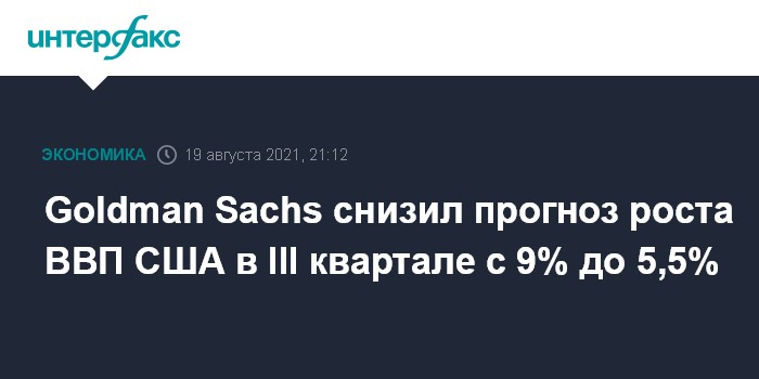 Москва. 19 августа. INTERFAX.RU - Аналитики Goldman Sachs ухудшили прогноз по росту ВВП США в III квартале до 5,5% с ранее ожидавшихся 9% из-за появления штамма коронавируса "дельта", сообщил банк.