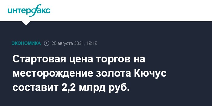 Москва. 20 августа. INTERFAX.RU - Стартовая цена торгов на месторождение золота Кючус (Якутия) составляет 2,2 млрд рублей, говорится в распоряжении правительства РФ о проведении аукциона.