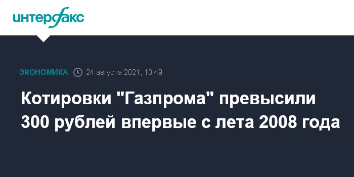 Москва. 24 августа. INTERFAX.RU - Цена акций "Газпрома" на "Московской бирже" к 10:19 вторника поднялась на 0,9%, до 300 рублей 39 копеек за бумагу. Она превысила отметку 300 рублей впервые с лета кризисного 2008 года на фоне общерыночного улучшения настроений.