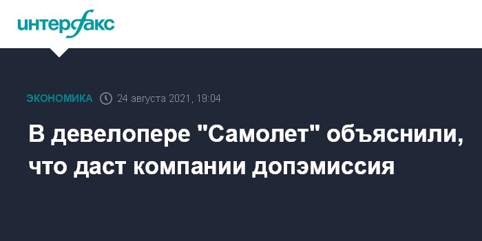 Москва. 24 августа. INTERFAX.RU - Наличие утвержденной допэмиссии даст компании гибкость на рынке капитала, объяснили "Интерфаксу" в девелопере "Самолет".