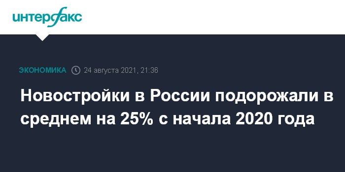 Москва. 24 августа. INTERFAX.RU - Цены на новостройки в России с начала 2020 года выросли в среднем на 25%, сообщил гендиректор ДОМ.РФ Виталий Мутко.