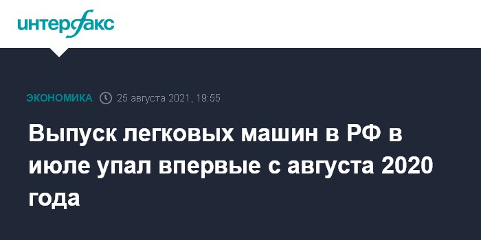 Москва. 25 августа. INTERFAX.RU - Производство легковых автомобилей в России в июле 2021 года впервые с августа прошлого года показало отрицательную динамику, снизившись в годовом выражении на 8,8%, до 102 тысяч штук. Это следует из данных Росстата и расчетов "Интерфакса" на основании публикаций ведомства за предыдущие периоды.