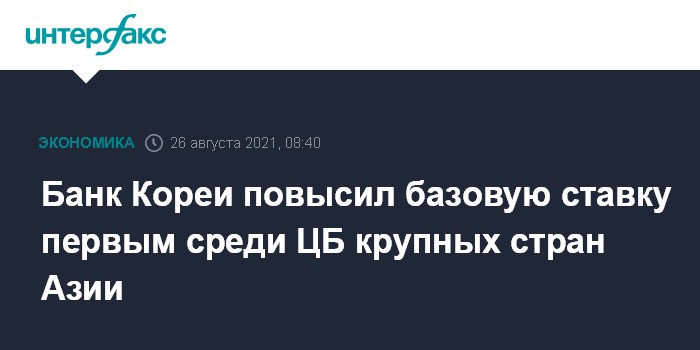 Москва. 26 августа. INTERFAX.RU - Банк Кореи повысил ключевую процентную ставку на 25 базисных пунктов - до 0,75% годовых. До этого она находилась на рекордно низком уровне в 0,5% годовых пятнадцать месяцев - с мая 2020 года. Повышение ставки произошло впервые почти за три года.