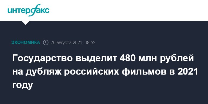 Москва. 26 августа. INTERFAX.RU - Государство в 2021 году выделит больше 450 млн рублей субсидий кинокомпаниям для перевода российских фильмов и сериалов на иностранные языки, на эту сумму уже заключено 11 соглашений, сообщили "Ведомостям" в Минэкономразвития. Еще 30 млн рублей субсидий на эти цели будет выделено позднее.