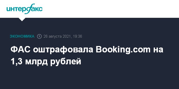 Москва. 26 августа. INTERFAX.RU - Федеральная антимонопольная служба (ФАС) оштрафовала сервис онлайн-бронирования отелей Booking.com на 1,3 млрд рублей (около $17,5 млн - ИФ) в рамках дела против агрегатора о навязывании гостиницам требования соблюдать паритет цен, говорится в сообщении регулятора.