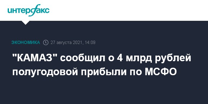 Москва. 27 августа. INTERFAX.RU - В I полугодии 2021 года чистая прибыль ПАО "КАМАЗ" составила 3,969 млрд рублей против 32 млн рублей годом ранее, сообщила компания.