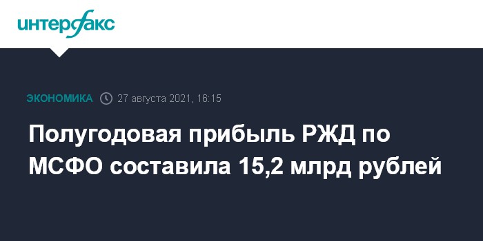 Москва. 27 августа. INTERFAX.RU - В I полугодии 2021 года чистая прибыль ОАО "РЖД" по МСФО составила 15,2 млрд рублей против убытка в 46,6 млрд рублей годом ранее, говорится в отчете компании.