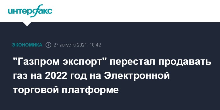 Москва. 27 августа. INTERFAX.RU - ООО "Газпром экспорт" на этой неделе перестало продавать газ на 2022 год на своей Электронной торговой платформе, сообщает агентство Bloomberg со ссылкой на источники.