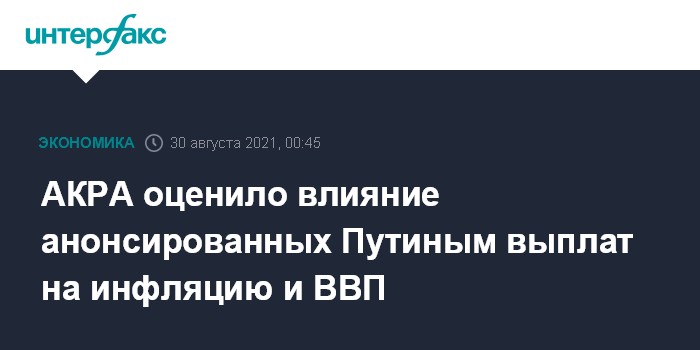 Москва. 30 августа. INTERFAX.RU - Новые разовые выплаты окажут влияние как на инфляцию в России в размере до 0,2 п.п., так и на рост ВВП РФ в интервале от нуля до 0,25 п.п., считают в Аналитическом кредитном рейтинговом агентстве (АКРА).