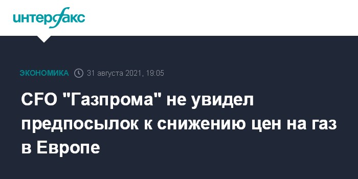 Москва. 31 августа. INTERFAX.RU - Нет никаких предпосылок к снижению цен на газ в Европе, заявил на телеконференции CFO "Газпрома" Александр Иванников, отметив высокие форвардные котировки цен на газ на площадке TTF в 2022 году.