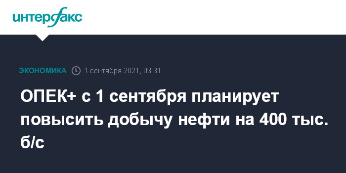 Москва. 1 сентября. INTERFAX.RU - Страны ОПЕК+ с начала сентября планируют повысить добычу нефти еще на 400 тыс. баррелей в сутки к августу.