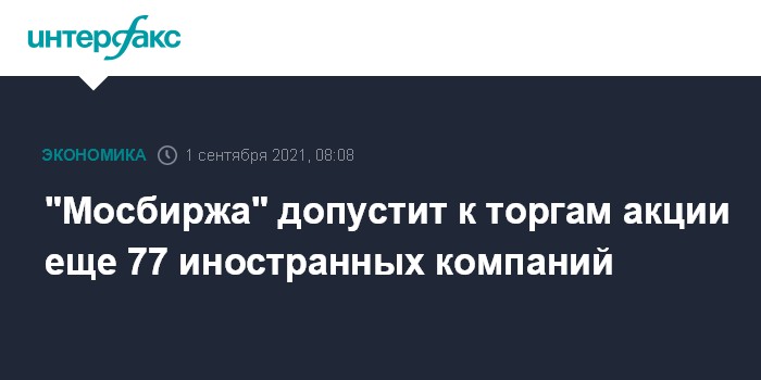 Москва. 1 сентября. INTERFAX.RU - "Московская биржа" с 1 сентября со среды начинает торги акциями еще 77 иностранных компаний, среди которых бумаги Robinhood, MSCI, Pinterest, Beyond Meat, JPMorgan Chase & Co. и News Corp.