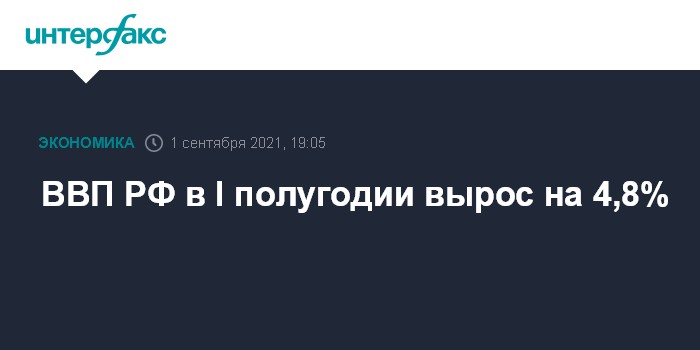 Москва. 1 сентября. INTERFAX.RU - ВВП РФ в I полугодии 2021 года вырос по сравнению с аналогичным периодом прошлого года на 4,8%. Такую оценку распространила в среду Федеральная служба государственной статистики (Росстат).