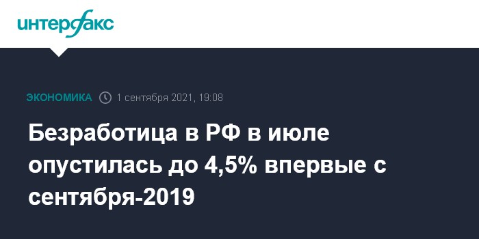 Безработица в РФ в июле опустилась до 4,5% впервые с сентября-2019