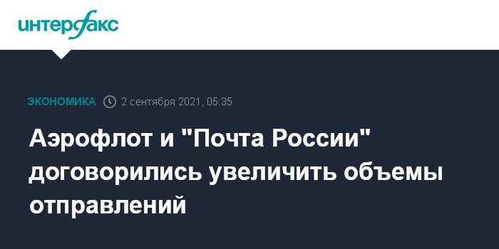 Москва. 2 сентября. INTERFAX.RU - "Аэрофлот" и "Почта России" намерены увеличить объемы перевозок почтовых отправлений.