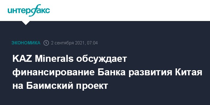 Москва. 2 сентября. INTERFAX.RU - Банк развития Китая может предоставить финансирование на реализацию проекта освоения Баимского медно-золотого месторождения на Чукотке, принадлежащего казахстанской KAZ Minerals.