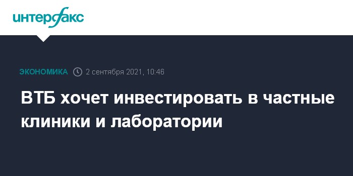 Москва. 2 сентября. INTERFAX.RU - ВТБ ведет переговоры с несколькими сетями частных клиник о вхождении в их капитал, проявляет интерес к сетям лабораторий, заявил журналистам глава банка Андрей Костин в кулуарах ВЭФ-2021.