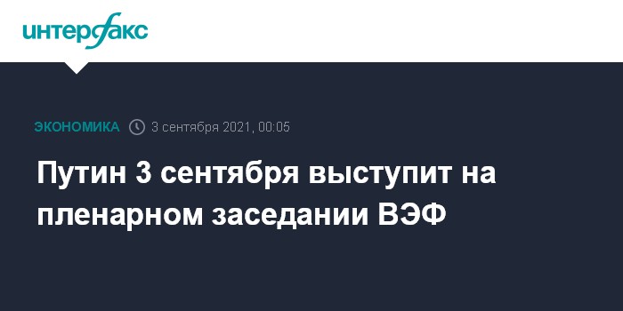 Путин 3 сентября выступит на пленарном заседании ВЭФ