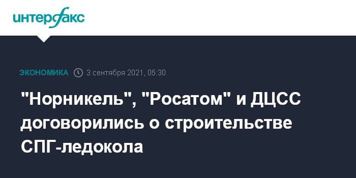 Москва. 3 сентября. INTERFAX.RU - "Норильский никель", госкорпорация "Росатом" и Дальневосточный центр судостроения и судоремонта (ДЦСС, входит в НК "Роснефть" ) заключили соглашение о намерениях совместно проектировать и строить двухтопливный дизель-СПГ ледокол. Документ был подписан в рамках Восточного экономического форума.