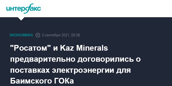 Москва. 3 сентября. INTERFAX.RU - ФГУП "Атомфлот" (предприятие ГК "Росатом") и подконтрольное Kaz Minerals ООО "ГДК Баимская" в рамках реализации комплексного плана инвестпроекта по освоению Баимской рудной зоны подписали предварительное соглашение о поставке электроэнергии для обеспечения работы Баимского ГОКа.