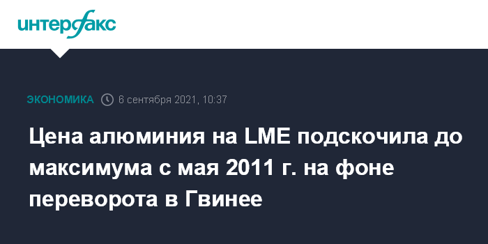 Москва. 6 сентября. INTERFAX.RU - Цена на алюминий в Лондоне подскочила до максимума более чем за 10 лет на фоне государственного переворота в Гвинее, поставившего под угрозу поставки бокситов из этой страны.