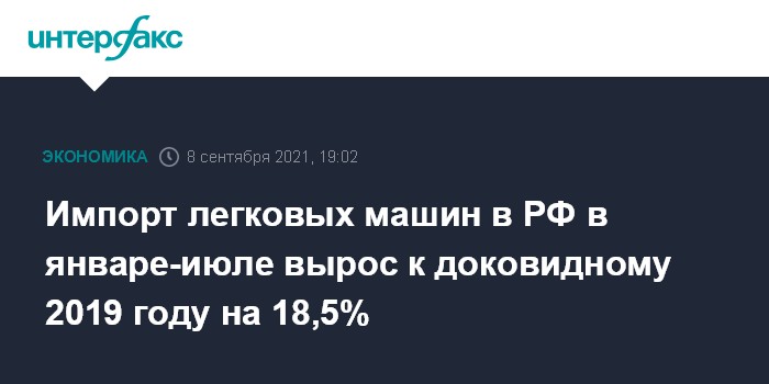 Москва. 8 сентября. INTERFAX.RU - Импорт легковых автомобилей в РФ в январе-июле 2021 г. был выше показателя аналогичного периода 2019 г. на 18,5% и на 82,4% превысил низкую из-за коронавирусных локдаунов базу 2020 г.