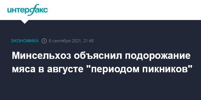 Москва. 8 сентября. INTERFAX.RU - Минсельхоз объясняет повышение отпускных цен на мясо в РФ в августе традиционными сезонным спросом, так называемым периодом шашлыков, и ожидает, что после его завершения сокращение спроса будет способствовать снижению цен.