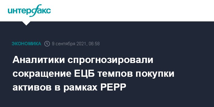Москва. 9 сентября. INTERFAX.RU - Европейский центральный банк (ЕЦБ) по итогам заседания в четверг, вероятно, оставит без изменений ключевую ставку, однако объявит о небольшом снижении темпов покупки активов в рамках экстренной программы Pandemic Emergency Purchase Programme (PEPP), полагают аналитики и экономисты.