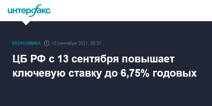 ЦБ РФ с 13 сентября повышает ключевую ставку до 6,75% годовых