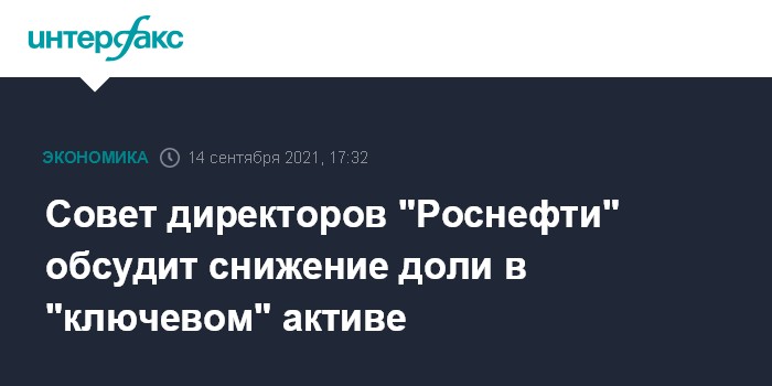 Москва. 14 сентября. INTERFAX.RU - Совет директоров "Роснефти" 17 сентября рассмотрит вопрос о сделках, влекущих уменьшение прямой доли участия компании в уставном капитале ключевого общества группы, сообщила компания. Что это за актив, не уточняется.