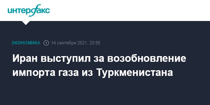 Москва. 14 сентября. INTERFAX.RU - Официальный представитель энергетической комиссии Меджлиса (парламента) Исламской Республики Иран Мустафа Нахаеи призвал к возобновлению импорта природного газа из Туркменистана, сообщают иранские СМИ.