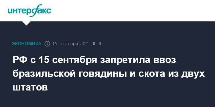 Кроме того, по этой причине Россельхознадзор с 15 сентября запрещает ввоз бескостной говядины, полученной от скота старше 30 месяцев, из штатов Мату-Гроссу и Минас-Жерайс. С этой же даты ограничивается транзит по РФ крупного рогатого скота из этих двух штатов.