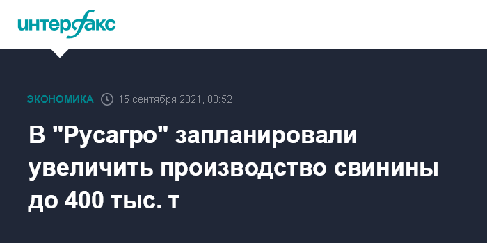 Москва. 15 сентября. INTERFAX.RU - Группа "Русагро" планирует увеличить производство свинины до 400 тысяч тонн в среднесрочной перспективе с 308 тысяч тонн в 2020 году, сообщается в презентации компании в Capital markets day.