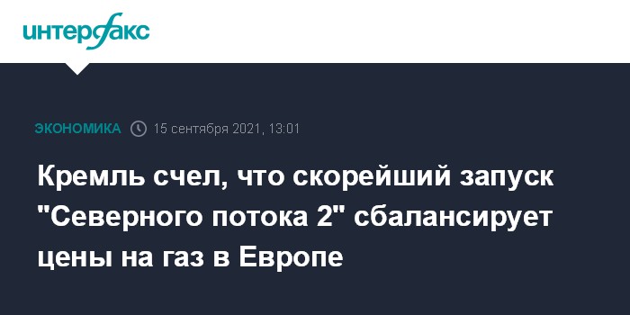 Москва. 15 сентября. INTERFAX.RU - Скорейший ввод в эксплуатацию "Северного потока 2" сбалансирует цены на природный газ в Европе, в том числе и на спотовом рынке, заявил пресс-секретарь президента РФ Дмитрий Песков.