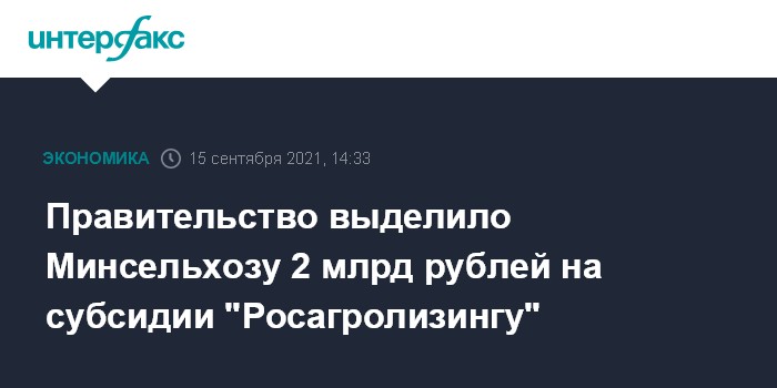 Москва. 15 сентября. INTERFAX.RU - Правительство выделило Минсельхозу из резервного фонда 2 млрд рублей для "Росагролизинга". Это следует из распоряжения кабинета министров, подписанного 13 сентября и размещенного на официальном портале правовых актов.
