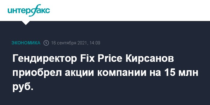 Москва. 16 сентября. INTERFAX.RU - Гендиректор Fix Price Дмитрий Кирсанов приобрел 26 405 GDR ритейлера по цене 567,7 рубля за бумагу на Московской бирже.
