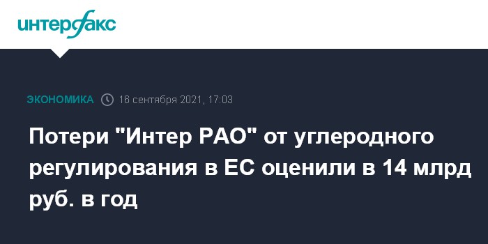 Потери "Интер РАО" от углеродного регулирования в ЕС оценили в 14 млрд руб. в год