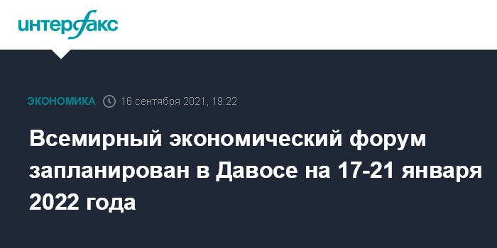 Москва. 16 сентября. INTERFAX.RU - Всемирный экономический форум запланирован на период с 17 по 21 января 2022 года в швейцарском Давосе, сообщили в четверг организаторы форума.