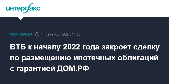 ВТБ к началу 2022 года закроет сделку по размещению ипотечных облигаций с гарантией ДОМ.РФ