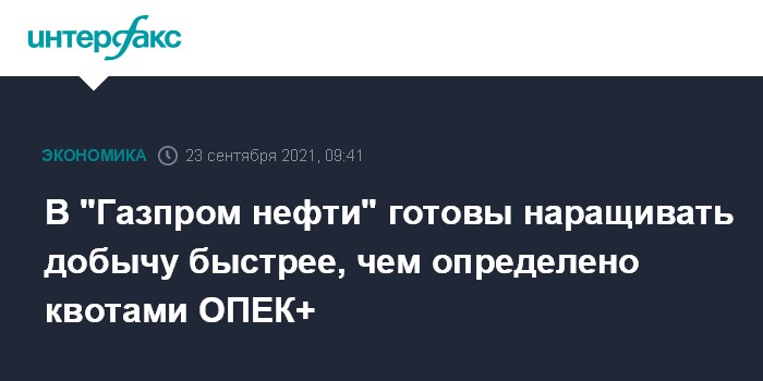 Москва. 23 сентября. INTERFAX.RU - "Газпром нефть" способна увеличить добычу нефти даже быстрее, чем определено текущими квотами ОПЕК+, заявил журналистам заместитель председателя правления компании Вадим Яковлев в кулуарах конференции SPE Annual Technical Conference в Дубае.