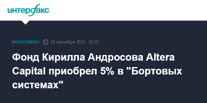 Москва. 23 сентября. INTERFAX.RU - ООО "Альтера Капитал" Кирилла Андросова приобрело 5% в компании "Бортовые системы", подконтрольной совладельцу "ВСМПО-Ависма" Михаилу Шелкову, следует из данных аналитической системы "СПАРК-Интерфакс".