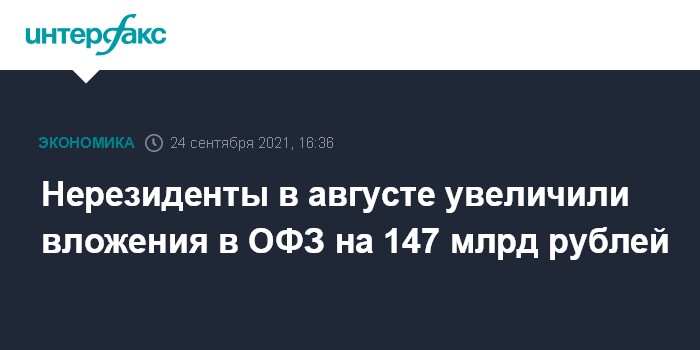 Доля нерезидентов в ОФЗ на 1 сентября 2021 года увеличилась до 21,4% с 20,6% на 1 августа, она стала максимальной с 1 марта (тогда она составила 22,7%).