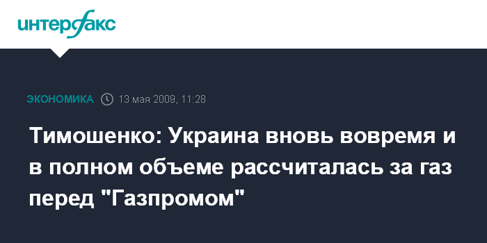 Москва. 13 мая. INTERFAX.RU – Премьер-министр Украины Юлия Тимошенко заявляет, что украинская сторона полностью и вовремя рассчиталась за газ перед "Газпромом".