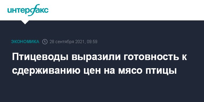 Москва. 28 сентября. INTERFAX.RU - Птицеводы РФ готовы к сдерживанию роста цен на мясо птицы, ждут согласия торговых сетей участвовать в этом процессе.